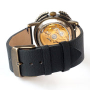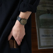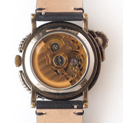 | Functions and Materials | [Movement] Mechanical, automatic with hand-winding function / 3 hands (Made in Japan) [Case] Brass / Case back and buckle are stainless steel [Belt] Vegan leather (black) [Windshield] Glass |