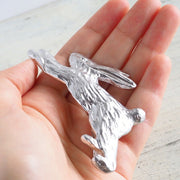 “sasakihitomi”(ササキヒトミ・ささきひとみ)アクセサリー作家・佐々木ひとみさんと、同じくアクセサリー作家の加藤由将さんが手がけるヘアーアクセサリー・髪飾りブランド、「二月(ふたつき)」。 自然の中を駆けてゆく野うさぎの姿が、ヘアクリップになって登場しました。 ぴょんっと軽やかに体を弾ませ、楽しそうに走り回るうさぎの姿を思わせる、かわいいシルエットが魅力的です。 ラフな雰囲気で表現された毛並みのおうとつが洒落た雰囲気。 使い勝手の良いクリップ仕様となっております。 愛らしいウサギがモチーフながらも、上品な輝きのメッキに瞳のスワロフスキーが、エレガントに演出してくれます。 ご自分用としてはもちろん、誕生日、クリスマス、バレンタイン、ホワイトデー、母の日、バースデーなどのギフト・プレゼントにもおすすめ。普段使いはもちろん、大きめ・大ぶり・大きいヘアアクセサリーなので、結婚式やパーティーなどの華やかなシーンでもお使いいただけます。浴衣や着物など和風の装いに合わせるのもいいかも。 ラッピングをご希望の方は、ご注文時の備考欄(自由記入欄)にてお伝え下さいませ。 |
