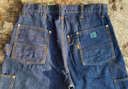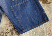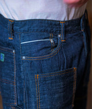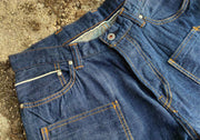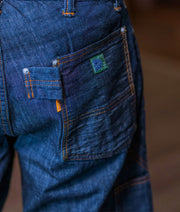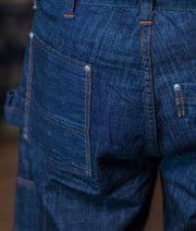 一般的なペインターパンツ等に用いられている太もも部分のポケットやハンマーループ、ツールポケットといったワークなディテールを詰め込んでいます。