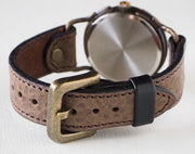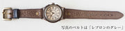 | 男女ともお使いいただけるLargeサイズのモデル。文字盤もおおきくデザインも見やすいから、ファッション性も◎。 バックル金具部分はアンティーク感のある真鍮素材でいい雰囲気。上質なベルトとしっかりマッチしています。 |