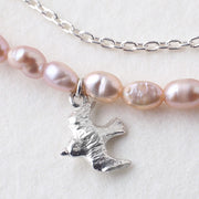 シルバーで作られた小さな渡り鳥と、淡くくすんだピンクのパール。やわらかく、さり気ない輝きが魅力的です。