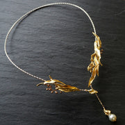 ナチュラルで優美な曲線を描く真鍮の葉、そこにチラリチラリと見え隠れするかのように、銅のつぼみたちが並ぶ…。ノスタルジックな雰囲気を纏ったドライフラワーのような、存在感を放つネックレスです。