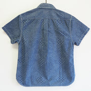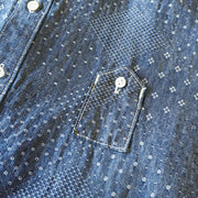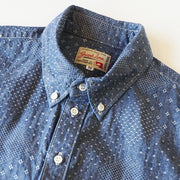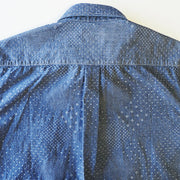 たて糸はインディゴロープ染色、緯糸は生成りからなるシャンブレー生地を使用しています。一見、無地のように見えますが、刺し子のような織り柄が生地全体に散りばめられています。ジャガード・ホワイト色は、より折り柄がはっきりわかる生地です。 日本伝統の家紋柄を思わせる一風変わった雰囲気の生地は、着れば着るほどに味わいが増してきます。襟はボタンダウンタイプ、ボタンには光沢のある貝ボタンを使用。