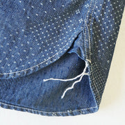 たて糸はインディゴロープ染色、緯糸は生成りからなるシャンブレー生地を使用しています。一見、無地のように見えますが、刺し子のような織り柄が生地全体に散りばめられています。ジャガード・ホワイト色は、より折り柄がはっきりわかる生地です。