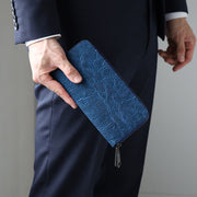 美しいブルーの染色が印象的な、象革ラウンドウォレットですゾウ革が希少な理由は、ゾウが保護の対象となる野生動物であることです。