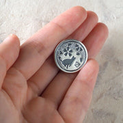 | 「エス」は、アクセサリー作家・三浦砂織さんによる和柄をモチーフとした手作りアクセサリーブランド。原型作りから仕上げまで、全てハンドメイドで制作をされています。 シンプルで合わせやすい丸型シルエットのコンチョ。 コンチョの意味は「飾りボタン」のことで、元々のボタンを取り替えイメージチェンジとして使うほか、革のグッズなどにつけたりカバンにつけたりと、ちょっとアクセントがほしいときの飾りとして活躍します。 可愛い桜と猫のシルエットが透かし彫りで表現された、小さくも存在感のあるアイテム。入学・卒業祝いなど、桜の季節のプレゼントにもぴったりですね。 このシルバーコンチョは、シルバー925(銀含有率92.5%)が使用されているので、使い込むほどに銀の深みある味わいが増してきます。 |