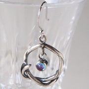 ゆらゆら揺れる宝石は、天然石のブルートパーズとルビーを重ね留めすることでこのような不思議な色彩を表現しています。