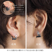 左右で着けた印象が変わります。頭が内側を向いているとぶら下がっているような見え方に(左耳図)。頭が外側を向いていると耳をよじ登っているような見え方に(右耳図)