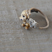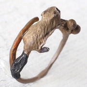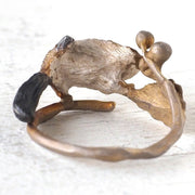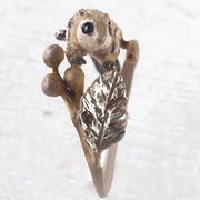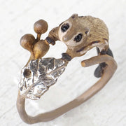 スラリと繊細な葉っぱとその茎がベースになった、モモンガと木の実のかわいいリングです。