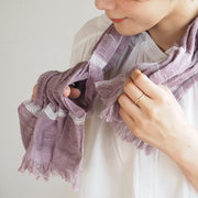 表は無地、裏はチェックで、さりげないリバーシブル仕様にしました。飾りすぎない短めのフリンジも◎