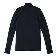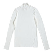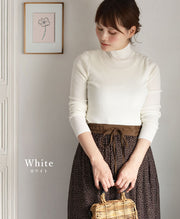 編みは細かなリブ編みで、薄く繊細に仕上げています。伸縮性がありながらも体のラインにやさしく沿い、ほどよいゆとりを保ちながらきれいなシルエットに。衿元もすっきりとしているため、ジャケットやカーディガンの下に重ねてももたつきません。ご自宅で手洗いできるのも、日常使いしやすいポイントです。