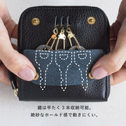 ![]() スマートキーを1つずつ、革で仕切られたポケットに収納できるので、 スマートキー同士がぶつかって傷つくことはありません。 その他のポケットには、カード類・紙幣などが収納可能。 「マチ」によって程よく開くので、中身を取り出しやすいのも魅力です。 ![]() 3本の鍵を平たく並ベて収納することで、厚みが抑えられています。 適度な膨らみと、鍵が動かないようホールド感を持たす為に、 絶妙な長さに切り込みが調整されています。 ![]() 忘れ物をした!電話が鳴っている!お手洗いに行きたい! 鍵が必要なときは、急いでいることが多いです。 すぐに取り出せるように、ファスナーの外側にポケットが作られています。 ![]() 鍵を入れる膨らみを生みながら、表面が凸凹しない構造を 何度も試行錯誤した結果、革の幅を両サイド5mmずつ広げることに。 外側の一枚革の半分だけ、両サイドをナナメに裁断。 これを経験値で実現できるのは、長年の職人技。 ![]() 穴の位置が低くても、革紐が長くても、スマートキーがこぼれ落ちてしまいます。 ミリ単位で調整を重ねて、今の「高さ」と「長さ」に辿り着きました。 ![]() 3本の指でスマートキーを持って人差し指を伸ばせば、 丁度スナップボタンに引っ掛けることができ、ほんの1秒で取り外しができます。 ディーラーで車を預ける時など、スマートキーだけを取り外したいシーンで役立ちます。 鍵の付け替えも、面倒さを感じません。 ![]() 電磁波が強いコインパーキングなど、スマートキーを取り出さないと反応しないような 場所でも、ファスナーを少し開ければすぐに取り出してボタンを押すことができます。 ![]() 縫製コストを極限まで抑え、使う革の量も減っています。 「良いもの」だからこそ、多くの方に使っていただける価格を目指されています。 ![]() 革はシュリンク牛革を使用。ふわふわの柔らかい手ざわりで、手にしっとり馴染みます。 ファスナーはYKK製で開閉もスムーズに。職人歴30年の熟練技による組立て技術と 美しい縫製が生み出す安心感と堅牢度。 ![]() 伝統的な技法で一つ一つ丁寧に作られた貼り箱に入れてお届けします。 こちらは、明治7年創業、京都・老舗の箱屋さんに別注されたもの。 新生活や記念日などの、プレゼントにもオススメです。