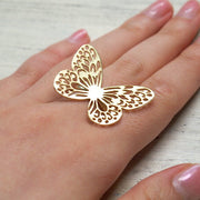 真鍮素材に18金メッキでゴージャス感のある雰囲気に仕上げられた丸みのあるシルエットが可愛らしさを漂わせる、模様まで繊細に表現されたちょうちょのリングSサイズです。