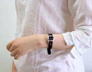 | ベルトの素材には質感の良い牛革を使用し、厚さは約3.5mmと存在感抜群。よくある腕時計のレザーベルトに比べて格段の耐久性を備え、上質さもただよっています。同価格帯の量産品の腕時計でも、ここまでのクオリティと存在感のあるレザーベルトを使用しているものは数少ないと思います。 クールなシルバーと、手作りらしい味ある文字盤…その絶妙なバランスによって、カジュアルスタイルやきちんとスタイルなど、様々なコーディネートに合わせやい腕時計へと仕上がっています。 華奢な印象と知的な女性らしさを演出しています。 コーディネートをググッと締めるアクセントとなってくれそうです。 |