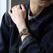 ケースの素材には、真鍮やシルバーなど、経年変化による味わいも楽しめる素材を採用。レザーベルトには、厚みがありながらフィット感に優れる本革を使用し、上質さと存在感を兼ね備えています。時の流れとともに愛着がわいてくる――そんな温かみにあふれています。