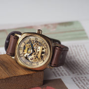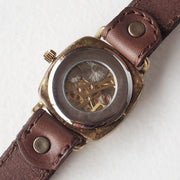 フルスケルトンの機械的な部分とアンティークさが魅力のモデルベルト:こげ茶ベルト×茶ステッチ