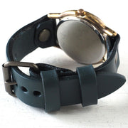 ベルトの素材には質感の良い牛革を使用し、しっかりとした厚みがあります。よくある腕時計のレザーベルトに比べて格段の耐久性と上質さを持っています