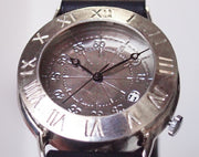 | 4時の位置にある小さな窓から、カレンダーの日付が顔をのぞかせています。文字盤には分を示す数字が点描で記されいます。時間を示す数字は、ケース枠にローマ数字で刻印されています。 一見シンプルですが、よく見ると凝ったデザインがお洒落です。シルバーの素材感が格好よく、大人っぽい印象です。 |