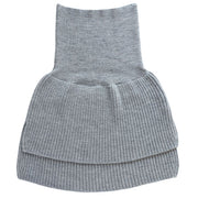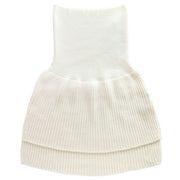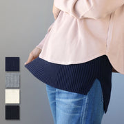 裾とおなか部分で糸の本数を変えて編むことで、厚みが調整されています。裾部分はローゲージのリブ編みでふっくら厚みをもたせてあたたかく、おなか部分はハイゲージで着ぶくれしないよう薄く編まれています。おなかに沿ってフィットしてくれるのでウェストに布がたまりにくくなっています。