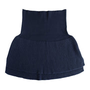 裾とおなか部分で糸の本数を変えて編むことで、厚みが調整されています。裾部分はローゲージのリブ編みでふっくら厚みをもたせてあたたかく、おなか部分はハイゲージで着ぶくれしないよう薄く編まれています。おなかに沿ってフィットしてくれるのでウェストに布がたまりにくくなっています。