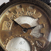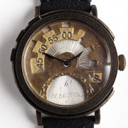 時計の針の回転とデザインの発想のもとになったタコメーターの意味を込めて「Rev.」と名づけられました。タコメーターのデザインと時計の針の回転を融合させた、手作りの腕時計です。