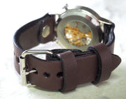 | ベルトの素材には質感の良い牛革を使用。よくある腕時計のレザーベルトに比べて格段の耐久性を備え、上質さもただよっています。同価格帯の量産品の腕時計でも、ここまでのクオリティと存在感のあるレザーベルトを使用しているものは数少ないと思います。 手巻き式ムーブメントの動きが楽しめるスケルトン仕様。また裏ぶたもスケルトン仕様となっており、裏返してみても動きを楽しむことができます。 |