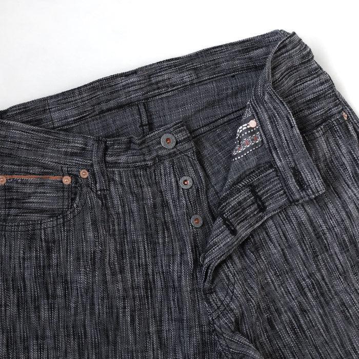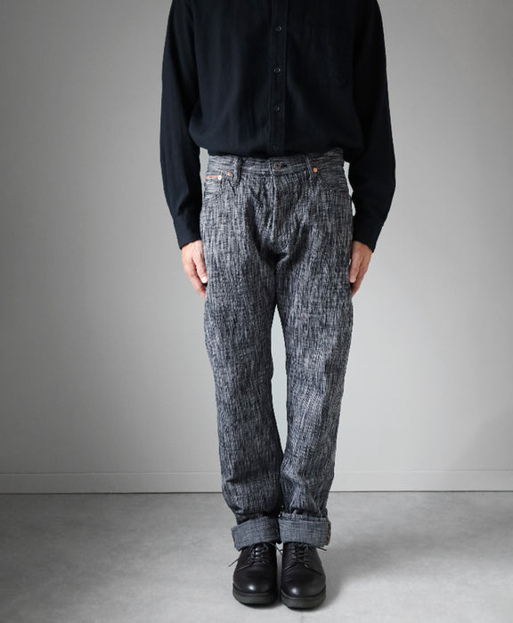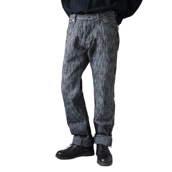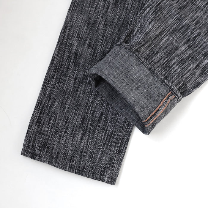 こちらのジーンズは経糸をインディゴで綛(カセ)染めし、ランダムに打ち込んでいます。