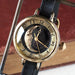 渡辺工房さんオリジナルの三日月がデザインされた、アンティークな腕時計。印象的な黒文字盤で夜空に浮かぶ三日月をイメージされています。