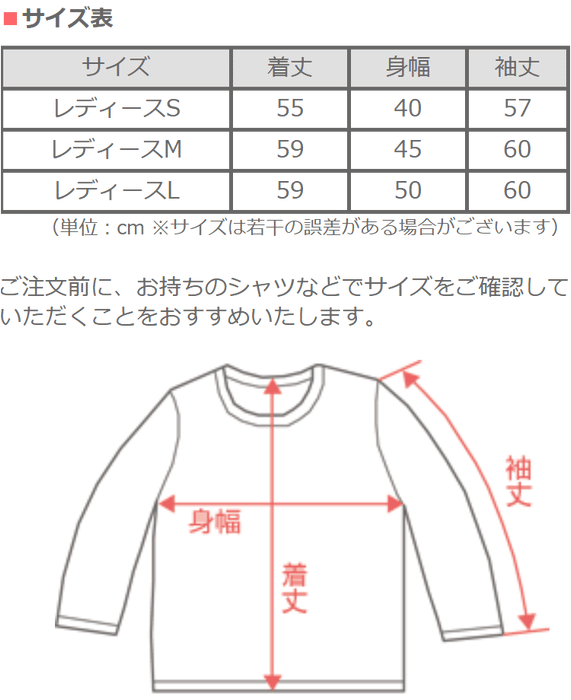 ご注文前に、お持ちのシャツなどでサイズをご確認していただくことをおすすめいたします。