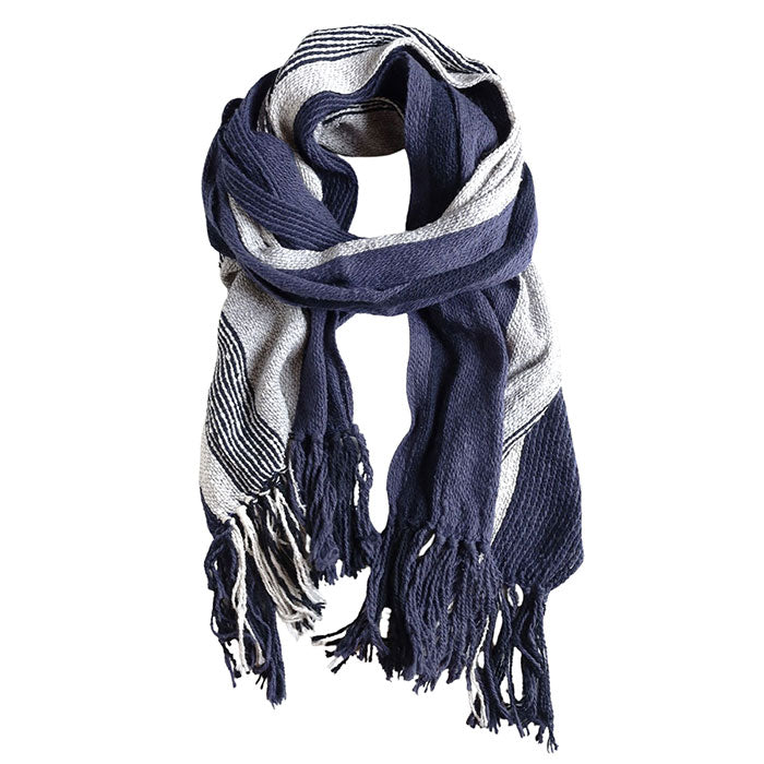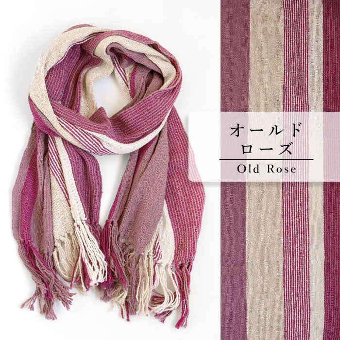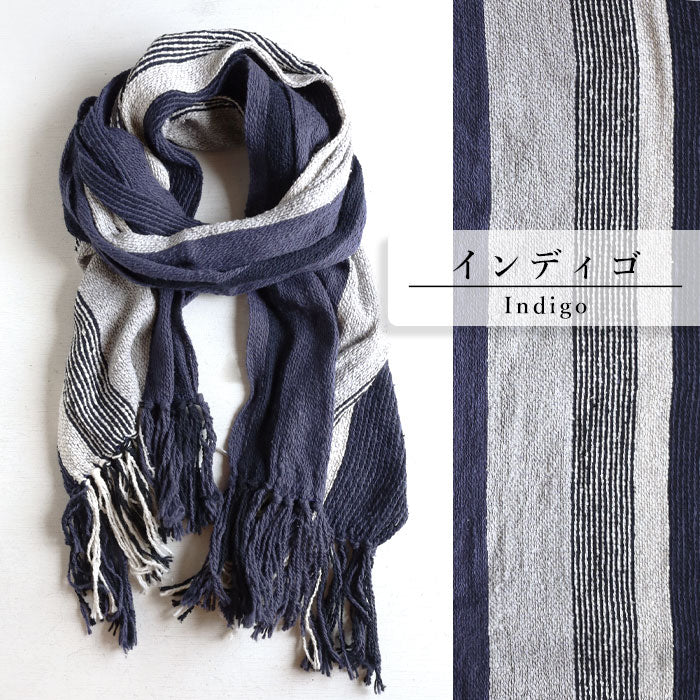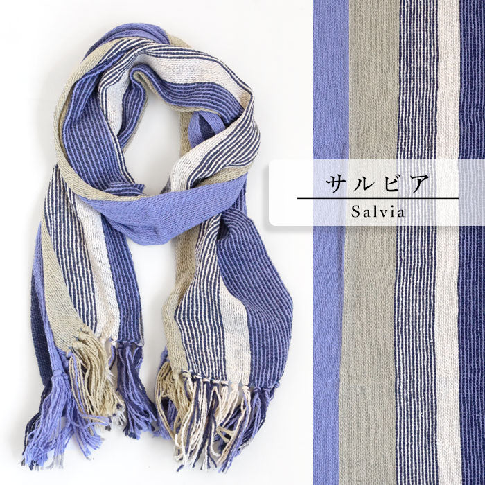 ランダムに並んだストライプが、さりげない個性を添える一枚。 一見するとシンプルな中に、よく見ると表情豊かな織りと配色が光ります。派手さはなくとも、身に着ける人の感性に静かに寄り添う――そんな大人のための“遊び心”を詰め込んだコットンマフラーです。