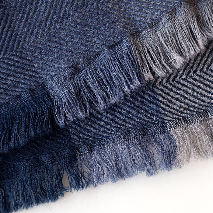 短めにデザインしたフリンジが邪魔にならず、 お家時間やオフィスでひざ掛けとしても重宝しそう。