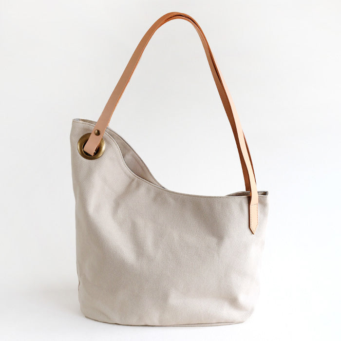 ベーシックに使いやすい生成り色のキャンバス生地。適度な光沢の本革ハンドルが上質な雰囲気をかもしだしています。アンティークな金具使いも飾りすぎず大人の洗練された印象に。