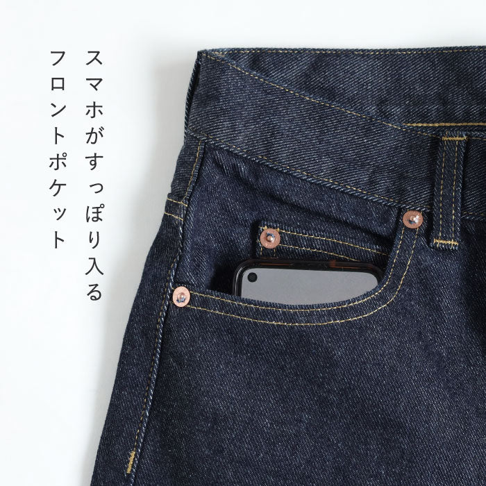 | 長く愛用したい方にぴったりな、定番ストレートデニム やわらかな色落ちが楽しめる左綾デニムを使用しています。 |