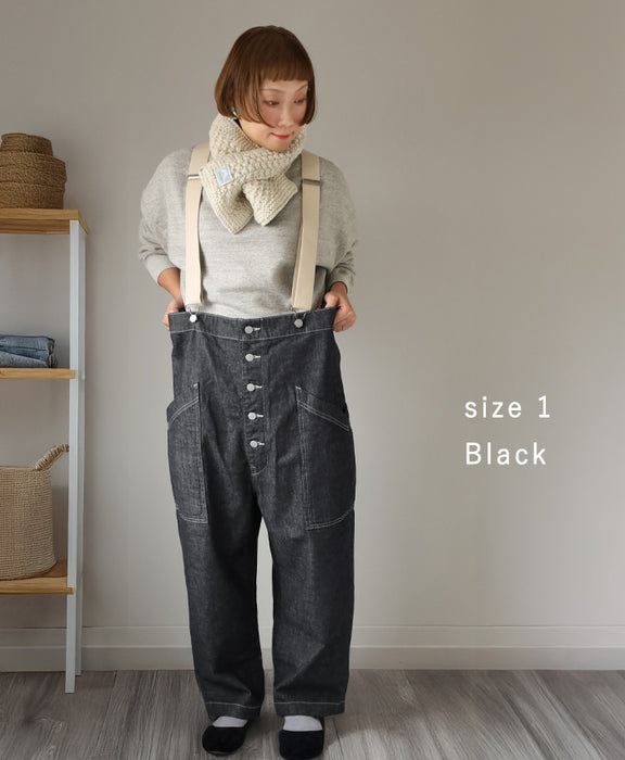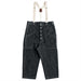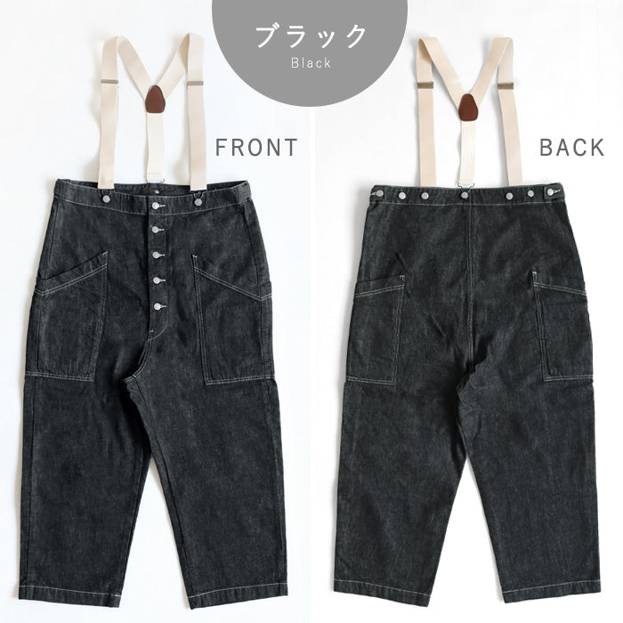 取り外しと調整が出来るサスペンダーつきのデニムパンツ。