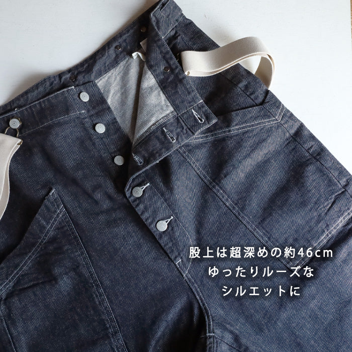 ゆとりのあるウエストとヒップで、デッキオーバーオールのような見た目でありながら、定番的なジーンズらしさも兼ね備えています。