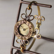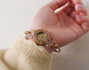 | 繊細で華奢なデザインは、アクセサリーを着けているような感覚に。女性らしさの詰まった美しい腕時計の登場です。 “fiore(フィオーレ)”はイタリア語で「花」を意味し、その名の可愛らしい響きにぴったりマッチする時計の愛らしさが、乙女心をくすぐります。 素材は真鍮。磨きのかかったゴールド仕上げとなっています。肌なじみのよい色合いで、腕周りをさり気なく華やかにしてくれます。 秒針が使用されておらず、静かに時を刻みます。時針、分針の細やかな作りにもウットリ・・・。全体的に有機的なフォルムをしており、可憐な花を連想させてくれます。 |