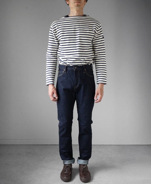 インディゴロープ染色による自然な色落ちと、繊維長の長い高級綿ならではの上品な光沢感。カジュアルな中に大人の落ち着きを感じる表情が魅力です。