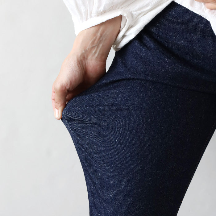 インディゴロープ染色による自然な色落ちと、繊維長の長い高級綿ならではの上品な光沢感。カジュアルな中に大人の落ち着きを感じる表情が魅力です。