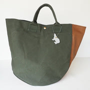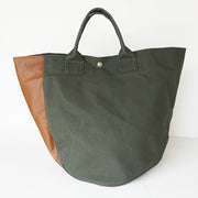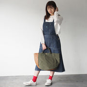 | 岡山県・倉敷産の9号帆布 × 姫路レザーを使用したトートバッグ コロンとしたフォルムに、アシンメトリーなデザインが個性的 |