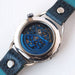 | パッと目をひく、スタイリッシュなブルーのムーブメント アンティークなシルバーのケースには歯車が。時計の鼓動を感じる自動巻き腕時計です。 |