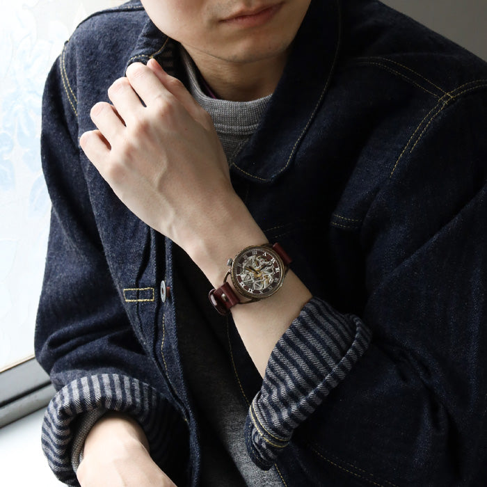 KINO(キノ) 手作り腕時計 自動巻き 裏スケルトン メカニックシルバー ワインブラウン [K-15-MSV-WI]