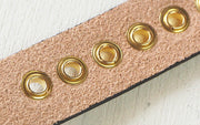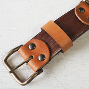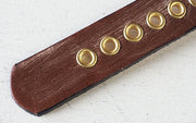 | 重厚な時計本体を支えるのに最適なベルトは、3ミリほどの厚みがある堅めの質感。穴はリングで補強されています。 素材は牛革で、ベースとなるブラウンの部分には少しダメージ加工がされており、重厚な時計の雰囲気をより一層引き立てています。 ベルトと本体をつなぐ部分は、ネジを使用した真鍮パーツでできており、サイドから見るととにかく格好いい!細かいパーツに思わず見とれてしまいます。 アンティーク加工された真鍮ケースは、新品ですが、古びたような質感。使用するにつれ経年変化が進むのも、真鍮ならではの特徴です。 |