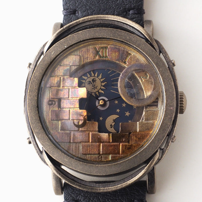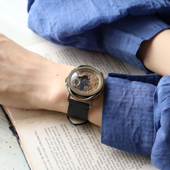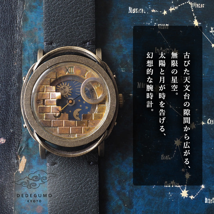 古びた天文台の隙間から覗く星空。太陽と月が時と共に巡る、真鍮の立体的な造形美が魅力の腕時計。