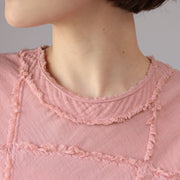 ラウンドネックの首元と袖口にも、切りっぱなしのふさふさのトリミングデザインがあしらわれ、シンプルなシャツをオシャレに演出しています。