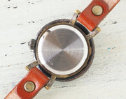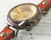 | 文字盤中央に葵の葉(hollyhock・ホーリーホック)のモチーフが刻まれた、ナチュラルでアンティークな雰囲気の腕時計。 真鍮製のケースは槌目仕上げとアンティーク加工が施されています。文字盤も真鍮製ですが、こちらは明るく磨いて仕上げてあり、カジュアルで親しみやすい印象にまとめられています。 |