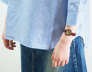 | シンプルで親しみやすく、カジュアルスタイルと相性の良い時計たち― 滋賀の琵琶湖湖畔の時計工房“vie”(ヴィー)にて生みだされる手作り腕時計は、日常のおしゃれにすっと馴染み、それでいてさりげない個性が光ります。 文字盤中央に葵の葉(hollyhock・ホーリーホック)のモチーフが刻まれた、ナチュラルでアンティークな雰囲気の腕時計。 真鍮製のケースは槌目仕上げとアンティーク加工が施されています。文字盤も真鍮製ですが、こちらは明るく磨いて仕上げてあり、カジュアルで親しみやすい印象にまとめられています。 ケースサイズは28mmで、レザーのベルトは華奢な9mm幅で、女性の腕にぴったりなサイズ感。カジュアルなスタイルにはもちろん、渋めのヴィンテージスタイルのアクセントにもおすすめです。 ベルトの先は、バックルやベルトループに通しやすいような形にデザインされています。ブラックやブラウンといったベーシックなベルトカラーをチョイスすれば、毎日のビジネススタイルにもよく合います。 ご自分用としてはもちろん、誕生日、クリスマス、バレンタインデー、ホワイトデー、バースデーなどのギフト・プレゼントにもおすすめ。ラッピングをご希望の方は、ご注文時の備考欄(自由記入欄)にてお伝え下さいませ。 |