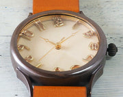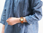 | 天然木を極薄に削り出した木製の文字盤に、真鍮の線材を曲げて作られた数字を配置した、シンプルな手作り腕時計。天然木の独特の風あい・色あいは目にも優しく、落ち着いた気持ちにさせてくれます。真鍮製のケースはいぶし仕上げで、使い込むほどに味わいを増していきます。 フラットな文字盤の木製パーツは、5種類からお選びいただけます(画像は「シナ」)。自然のぬくもりを感じる木目の表情は一つ一つ異なり、世界に一つだけの腕時計となります。 |