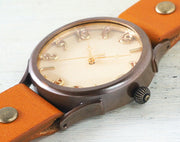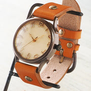 | いぶし仕上げの真鍮製ケースと天然木の文字盤はアンティーク感にあふれ、カジュアルなスタイルやヴィンテージスタイルにぴったり。男女問わず着用いただけるサイズ感です。ベルトの先は、バックルやベルトループに通しやすいような形にデザインされています。 |