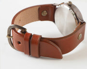 | いぶし仕上げの真鍮製ケースと天然木の文字盤はアンティーク感にあふれ、カジュアルなスタイルやヴィンテージスタイルにぴったり。男女問わず着用いただけるサイズ感です。ベルトの先は、バックルやベルトループに通しやすいような形にデザインされています。 |