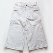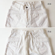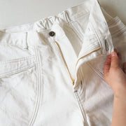 The front is a standard type with a zipper fly. The large side pocket is sized to comfortably fit a smartphone or notepad. The part where the fabric overlaps has a double pocket, which is very convenient to put important things in! It's perfect functionality as work clothes. The more you wear it, the softer the fabric will be and the more it will become familiar with your skin. The crisp and refreshing white denim is stitched with gray thread, which is also the accent of the design.